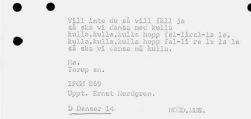 //// Vill inte du så vill fäll ja så ska vi dansa med kulla kulla«kulla,kulla hopp f al-liral-la la, ^ kulla,kulla,kulla hopp fal-li ra la la la //// så ska vi dansa mä kulla. //// Ha. //// Torup sn. IFGH 869 //// Uppt. Ernst Nordgren. D Danser 14 NORD.MUS. //// mmmmmimmmmmm—w¦ i i... ////