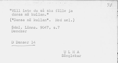 //// ¦ - ... - ¦ • " " 70 //// "Vill inte du så ska falle ja dansa mä kullan." //// ("Dansa mä kullan". Med mel.) //// Sami. Länna. 9047, s.7 Dencker //// D Danser 14 //// U L M A i //// Sånglekar ¦ //// i ¦ ////