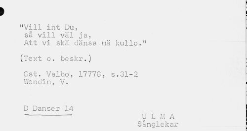 //// ) Ii //// "Vill int Du, : //// sa vill val ja, Att vi skä dansa mä kullo." //// (Text o. be skr.) //// Gst. Valbo, 17778, s.31-2 //// Wendin, V. t //// D Danser 14 //// ---U L M A //// Sånglekar | ////