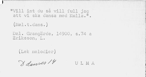 //// nVill int du så vill full jag att vi ska dansa med Kulla.". //// (Mel.t.dans.) //// Dal. Grangärde, 14900, s.74 a Eriksson, L. //// (Lek me1odier) //// ^ SfS U L M A | ////