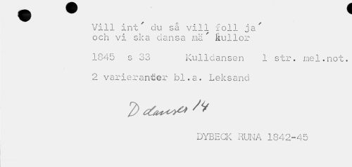 //// Vill int" du sä vill foll ja" och vi ska dansa mä' åullor //// 1045 s 33 Kulldansen 1 str. mel.not. //// 2 varierantier bl.a. Leksand //// DYBECK RUNA 1842-45 ////