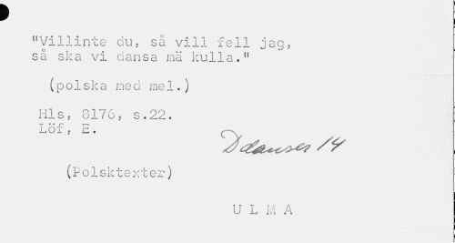 //// p //// "Villinte du, så vill fell jag, så ska vi dansa mä kulla." //// (polska med mel.) //// Hls, 8176, s.22. //// LO i ? il • //// (polsktexter) //// U L M A ////