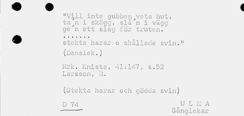 //// "Vill inte gubben^veta hut, //// ta n i skägg, slå n i vägg ge 'n ett slag för truten. //// ^^ stekta harar o skållade svin." //// (Danslek.) //// Nrk. Knista, 41:147, s.52 Larsson, R. //// (Stekta harar och gödda svin) //// D 74 oU L M A ---Sånglekar ////