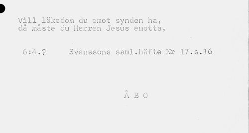 //// 9 //// Vill läkedom du emot synden ha, då måste du Herren Jesus emotta, //// t //// i //// 6:4.? Svenssons saml.häfte Nr 17.s.16 //// Å B O ////