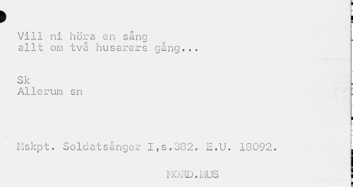 //// > ! //// Vill ni höra en sång //// allt om två husarers gång... //// Sk //// Al lerum sn : //// ¦ //// i. //// Mskpt. Soldatsanger ljS.382. E.U. 13092. L //// MORD.MUS | ////