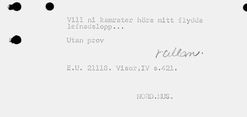 //// Vill ni kamrater höra mitt flydda lefnadslopp . . . //// E.U. 21113. Visor,IV s.421. //// NORD.MUS. ////