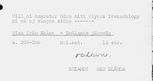 //// > [ //// Vill ni kamrater höra mitt flydda levnadslopp ni må ej sången störa --- //// Visa från Skåne - Smålands järnväg s. 204-206 Mel.not. 13 str. //// BRIANDT MED SLÄGGA I ////