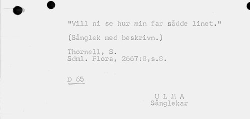 //// HVill ni se hur min far sådde linet." (Sånglek med beskrivn.) Thorne11, S. //// Sdrnl. Flora, 2667:8,s.8. //// U L M A //// Sånglekar ////