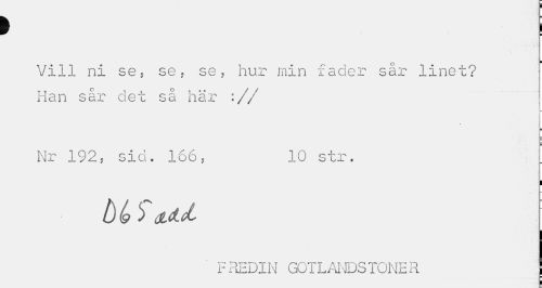 //// ? ! //// Vill ni ses se. se, hur min fader sår linet? Han sår det så här :// //// Nr 192, sid. 166, 10 str. //// i //// ué> 3 (tdd //// FHEDIN GOTLANDSTONER ////