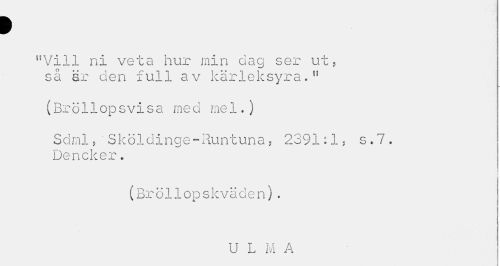 //// > //// nVill ni veta hur min dag ser ut, så sr den full av kärleksyra.n //// (Bröllopsvisa med mel.) //// Sdml,'Sköldinge-Runtuna, 2391:1, s.7. Dencker. //// (Bröllopskväden). //// U L M A ////