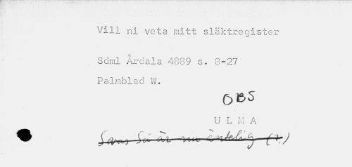 //// 1- " • , , Vill ni veta mitt släktregister //// Sdml Årdala 4889 s. 8-27 Palmblad W. //// ö&s //// U L M A ////