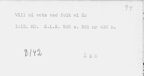 //// Vill ni veta vad folk vi är ' //// 1:12. KO. S.L.S. 508 s. 591 nr 430 b. //// ÅBO //// i ¦ //// ¦ ////