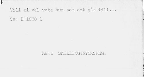 //// f //// Vill ni väl veta hur som det går till... //// i //// Se: E 1338 1 //// KB : s SKILLINGTRYCKS REG. i- //// ¦ //// ¦ ////