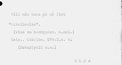 //// f //// Vill nan Kuxa pa na xmt //// l!Ockelbovisa,f. //// (visa om he mbyg den, m.me1.) Gstr., Ockelbo, 574:2,s. 4; //// J: i //// (N a t ur1yri k m. m.) //// U L M A ////