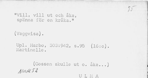 //// jr //// "Vill, vill ut och åka, spänna för en kråka." //// (Vaggvisa). //// Upl. Harbo, 303:942, s.95 (16:o). Martinelie. //// (Gossen skulle ut o. åka...) //// U L M A i ////