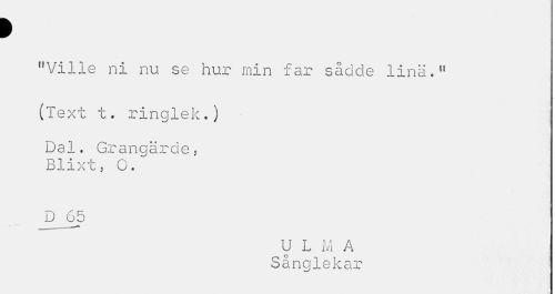 //// > //// "Ville ni nu se hur min far sådde lina.11 //// (Text t. ringlek.) //// Dal. Grangärde, Blixt, G. //// D _65 //// U L M A //// Sånglekar ////