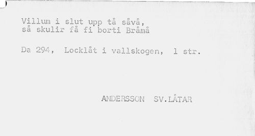 //// / //// Villum i slut upp ta //// sa va« //// så skulir få fl borti Bråmå //// Da 294, Locklåt I vallskogen, 1 str. //// ¦ ? "é / //// ANDERSSON SV. LÅTAR ////