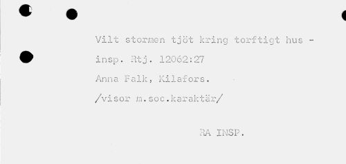 //// Vilt stormen tjöt kring torftigt hus -^^ insp . Ht j . 12062:27 //// Anna F a1k, Ki1afors. /visor m. soc.karaktär/ //// RA INSP. ////