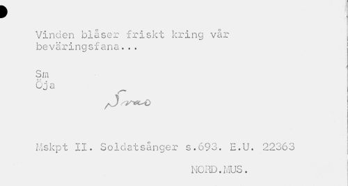 //// p //// Vinden blåser friskt kring vår beväringsfana... //// i //// Sm //// o //// Oj a //// ^J o //// | //// i i //// Mskpt II. Soldatsånger s.693. E.U. 22363 //// 1 //// NOi-iD. MUS. ////