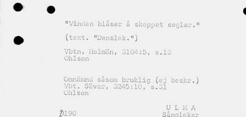 //// "Vinden blåser å skeppet seglar." //// ^ (text. "Danslek.11) //// Vbtn, Holmön, 3104:5, s.13 Ohlson //// r //// Omnämnd såsom bruklig (ej be skr.) Vbt, Sävar, 3245:10, s.31 Ohlson //// U L M A //// /)190 Sånalekar ////
