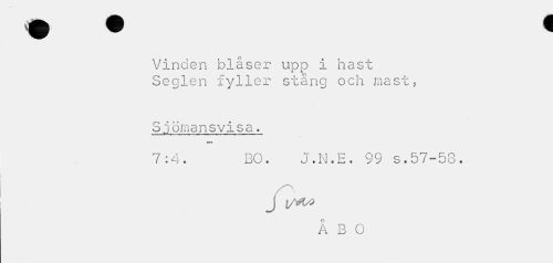 //// Vinden blåser upp i hast Seglen fyller stång och mast. //// Sjömansvisa. //// 7:4. BO. J.N.E. 99 s.57-58. //// J i/vt* //// ÅBO ////