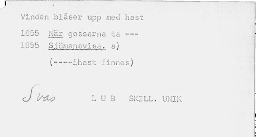 //// Vinden blåser upp med hast //// i //// 1855 När gossarna ta —-1855 Sjömansvisa. a) //// (——ihast finnes) //// <J Ia&O L U B SKILL. UNIK //// ! ¦ ////
