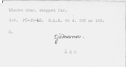 //// f //// Vinden drar, skeppet far, //// i //// 3:4. FÖ-JO-fcE. S.L.S. 46 s. 395 nr 149. //// ]\T //// Å B O ////