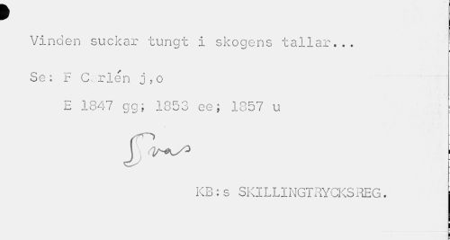 //// 9 //// Vinden suckar tungt i skogens tallar... //// Se: F C.rlén j,o //// E 1847 gg, 1853 ce; 1857 u //// Vyty^Ks ° i //// KB:s SKILLINGTRYCKSREG. ////