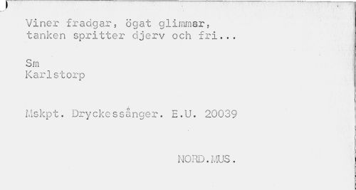 //// Viner fradgar, ögat glimmar, tanken spritter djerv och fri... //// Sm //// Karlstorp //// Mskpt. Dryckessånger. E.U. 20039 //// NORD.MUS. ////