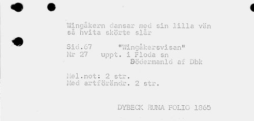 //// Wingåkern dansar med sin lilla vän så hvita skörte slår //// ^^ Sid. 67 "Wingåkersvisan11 //// Nr 27 uppt. i Flöda sn //// Bcdermanld af Dbk //// Mel.not: 2 str. //// Me d ar t f ör ä n dr. 2st r. //// DYBECK RUNA FOLIO 1865 //// - • * ////