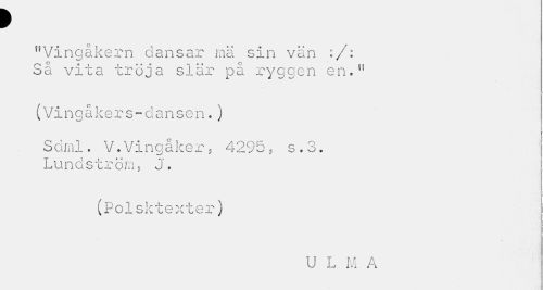 //// f //// "Vingåkern dansar mä sin vän :/: Så vita tröja slär på ryggen en«n //// (Vinqåkers-dansen.) //// » w * //// Sdml. V.Vingåker, 4295 , s.3. Lundström, J. //// (Polsktexter) //// U L M A ////