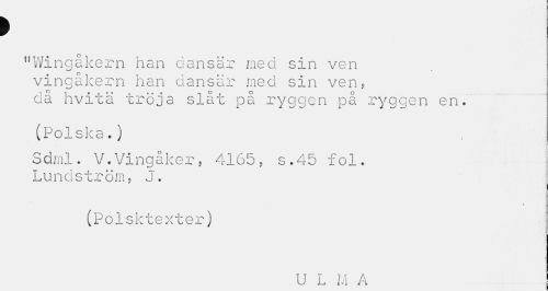 //// > //// "Wingåkern han dansar med sin ven vingåkern han dansar med sin ven, då hvitä tröja slåt på ryggen på ryggen en. //// (Polska.) //// Sdml. V.Vingåker, 4165, s.45 fol. Lundström, J. //// (Polsktexter) //// U L M A ////