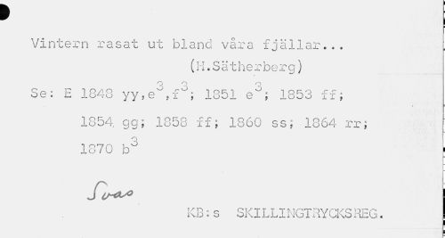 //// ¥ //// Vintern rasat ut bland våra fjällar... //// (H.Sätherberg) //// Se: E 1848 yy,eö,x°; 1851 e°; 1853 ff; //// 1854. gg; 1858 ff; 1860 ss; 1864 rr; //// 1870 hö i //// S^u-auo i //// KB:s SKILLINGTRYCKSREG. ////