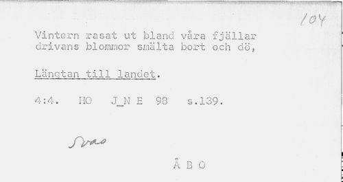 //// /0Kf //// Vintern rasat ut bland våra fjällar ' //// drivans blommor smälta bort och dö, v //// Längtan till landet. //// 4:4. HO JJnJ E 98 s.139. //// i //// åbo : //// i ////