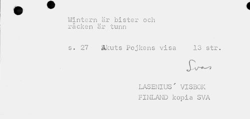 //// Wintern är bister och räcken är tunn //// s. 27 Äkuts Pojkens visa 13 str. //// LASENIUS' VISBOK FINLAND kopia SVA ////