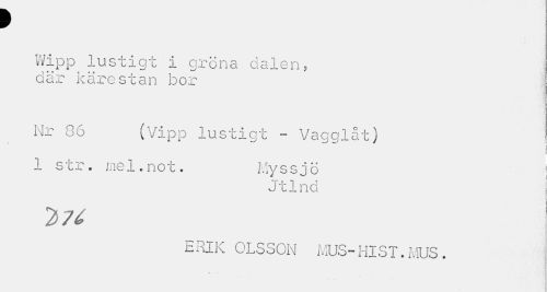 //// t //// Wipp lustigt i gröna dalen, där käre stan bor //// Nr 86 (Vipp lustigt - Vagglåt) //// c //// 1 str. mel.not. Myssjö j //// Jtlnd //// ERIK OLSSON MUS-MIST.MUS. //// % - ////