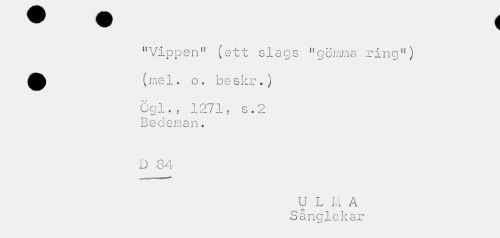 //// "Vippen" (ett slags "gömma ring") A (mel. o. be skr.) //// Ögl., 1271, s.2 //// Bedeman. //// D 34 //// U L M A //// Sånglekar ////