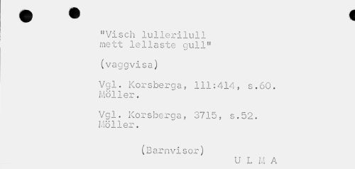 //// "Visch lullerilull me 11 leiläste gulln //// (vaggvisa) //// Vgl. Korsberga, 111:414, s.60. Möller. //// Vgl. Korsberga, 3715, s.52. Möller. //// (Barnvisor) //// U L M A ////