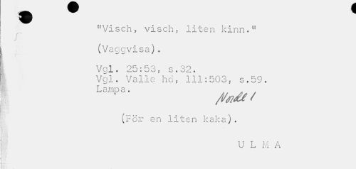 //// 9 //// "Visch, visch, liten kinn." //// f //// (Vaggvisa). //// Val. 25:53, s.32. Vgl. Valle hd, 111:503, s.59. Lampa. „ , //// ftfldi / //// (För en liten kaka). //// U L M A ////
