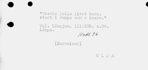 //// "Vischa lulla litet barn, stort i rumpa som e kvarn." //// Vgl. Längjum, 111:235, s.94. //// L a mp3 • //// //evtt H //// (Barnvisor) //// U L M A ////