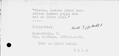//// " ... ... ... - „ „, , 4,. j //// "Vischa, luscha litet barn rättnu kommer pappa hem med en liten kaka." //// (Vaggvisa) . ^^ 3/fr ^ / //// Brandström, T. //// Vgl. N.Vånga, 2850:1,s.63. //// ^ (För en liten kaka). //// U L M A ////