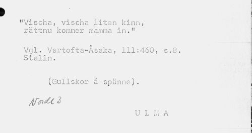 //// > //// "Vischa, vischa liten lcinn, rättnu kommer mamma in.n //// o //// Vgl. Vartofta-Asaka, 111:460, s.8. Stalin. //// (Guliskor å spänne). //// /{féncUl //// U L M A ////