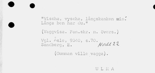 //// "Vis ch a, vy s ch a, 1ångskanken min f Långa ben har du." //// Bw //// (Vaggvisa, ron.skr. m. övers.) //// Vgl. Åsle5 9340, s.70. Sandberg, E. % <, //// (Gumman ville vagga). //// w //// U L M A ////