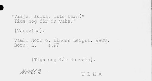 //// I //// 11 Vis ja, lulla, lite barn T" Tids nog får cu vaka." //// (Vaggvisa). //// Vsml. Nora o. Lindes bergsl. 9909. Boro, E. s.97 //// (Tigs nog får du vaka). //// /Mt 1 y L M A ////