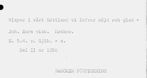 //// > //// Visper i vårt Gottland vi lefver nöjd och glad - j- //// Joh. Eur s vi sb. Maskm o . W. 5.4. n. Sjöb. - s. //// t 1 //// Del II nr 1256 //// RANCKEN FÖRTECKNING ////