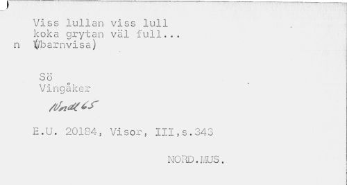 //// Viss lullan viss lull koka grytan väl full... n '(/barnvisa) //// <r //// So //// Vingåker //// E.U. 20184, Visor, III,s.343 //// NORD.MUS. ////