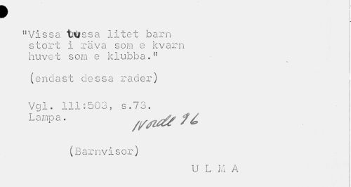 //// p //// "Vissa tstiissa litet barn i //// stort i räva som e kvarn huvet som e klubba." //// v //// (endast dessa rader) I //// Vgl. 111:503, s.73. //// Lampa. /f/utfft j //// (Barnvisor) //// U L M A ////