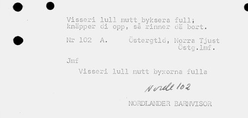 //// Visseri lull mutt byksera full; //// knäpper di opp, så rinner dä bort. //// Nr 102 A. Ostergtld? Norra ljust //// Ostg.Imi. //// Jmf //// Visseri lull mutt byxorna fulla //// NORDLANDER BARNVISOR ////