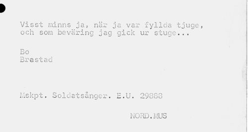 //// p //// Visst minns ja , när ja var fyllda tjuge, och som beväring jag gick ur stuge... //// Bo //// Brestad //// ¦ //// Mskpt. Soldatsånger. E.U. 29883 //// NORD.MUS ////
