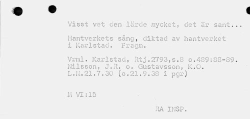 //// t • i //// Visst vet den lärde mycket, det är sant... //// v //// Hantverkets sång, diktad av hantverket i Kar 1 s t a cl. F r a gm. //// Vrml. Karlstad, Rtj.2793,s.8 0.489:88-89. Nilsson, J.R. o. Gustavsson, K.O. L.M.21.7.30 (o.21.9.38 i pgr) //// M VI:15 //// RA IMSP. ////